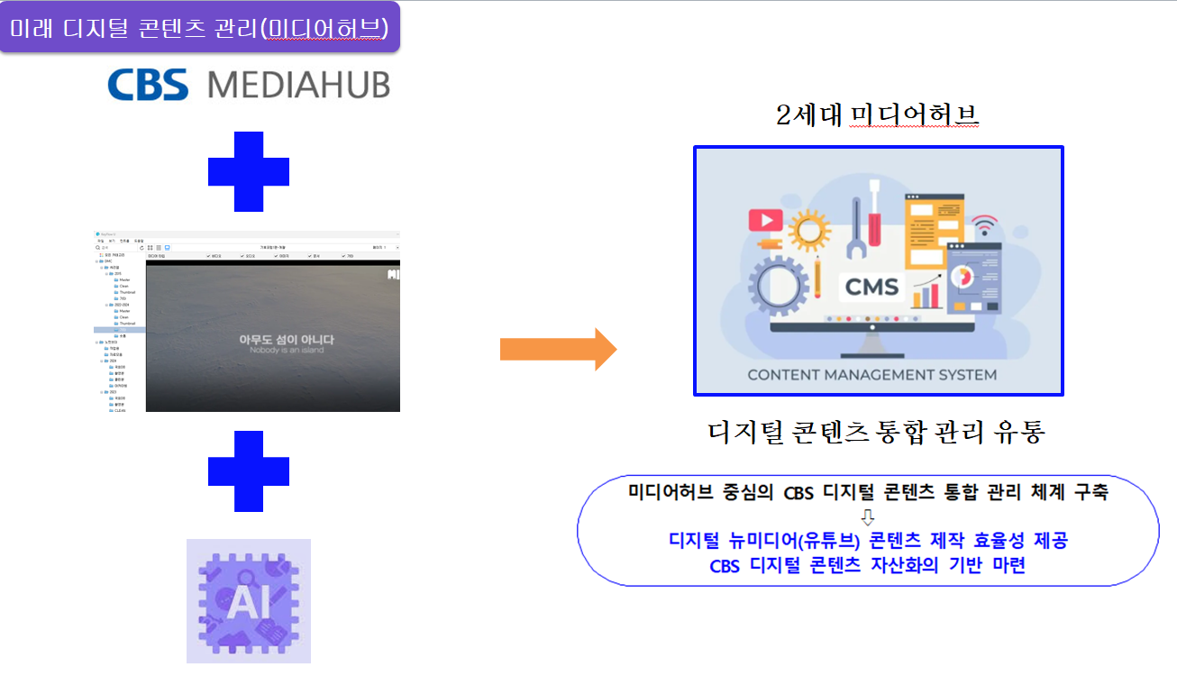 하나는, AI 기술을 응용한 디지털 콘텐츠 통합 관리 시스템 구축, 즉 ‘미디어허브 2.0의 고도화’입니다.