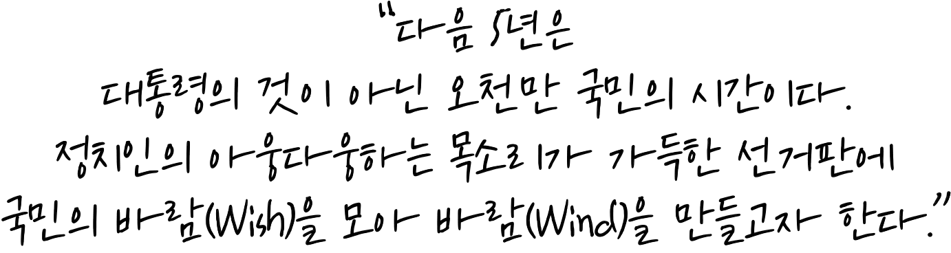 ํ์ง๋ง, ์ ๊ฑฐ๋ ์กฐ๊ธ ๋ค๋ฅด๋ค๊ณ ์๊ฐํ์ต๋๋ค. ๋ฌผ๋ก ๋ ๋ฒ์ ํํต์ ๊ฒช์ ๋ํ๋ฏผ๊ตญ์ ์ด๋ ์ฐจ๊ธฐ ํ๋ณด์๋ฅผ ๊ฒ์ฆํ๋ ์ผ๋ ๋๋จํ ์ค์ํฉ๋๋ค. ๊ทธ๋ฌ๋ ๊ทธ์ ๋ชป์ง์๊ฒ ์ค์ํ ์ฃผ์ธ๊ณต์ด ์์ต๋๋ค. ์ง๊ธ ์ด ์๊ธฐ๋ฅผ ์ด์๊ฐ๋ ๊ตญ๋ฏผ๋ค, ์ ๊ถ์์ ๋๋ค. ํ์ค๊ณผ ๋ฐ์ ํ ์ ์น, ํ์ค์ ์๋ฟ๋ ์ ์น๋ฅผ ๋ง๋ค๊ธฐ ์ํด์๋ ๊ตญ๋ฏผ์ ๋ฐ๋์ ์ ํ๋ ์ผ์ ์ค์ํ์ต๋๋ค. ๊ทธ๋ฆฌ๊ณ ์ด ๋ฐ๋๋ค์ด ๋ชจ์ด๋ฉด ๋ํ๋ฏผ๊ตญ์ ์ฒญ์ฌ์ง์ด ๋ ๊ฒ์ ๋๋ค.